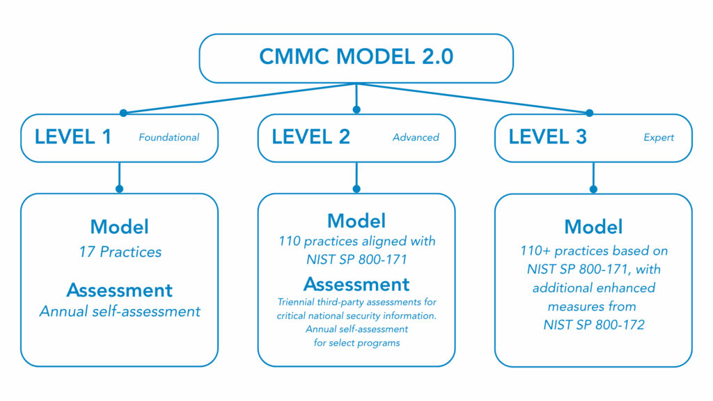 - Level 1 (Foundational) – for companies with FCI only; information requires protection but is not critical to national security