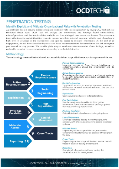 At OCD Tech, we help safeguard your business by simulating real-world attacks on your systems. Our penetration testing, also known as “ethical hacking,” involves acting like hackers trying to break into your network, identifying weaknesses before malicious actors do. We examine your environment for vulnerabilities—such as weak passwords or outdated software—and try to exploit these issues to show just how far a real hacker could get. This helps uncover potential risks, like gaining unauthorized access to sensitive data. Unlike simple vulnerability scans that just list problems, penetration testing demonstrates the real-world impact of those vulnerabilities. Our goal is to help you strengthen your defenses, so you can protect your business and customer information. The exact details of the test are tailored to your needs, ensuring we’re focusing on what matters most to your company.